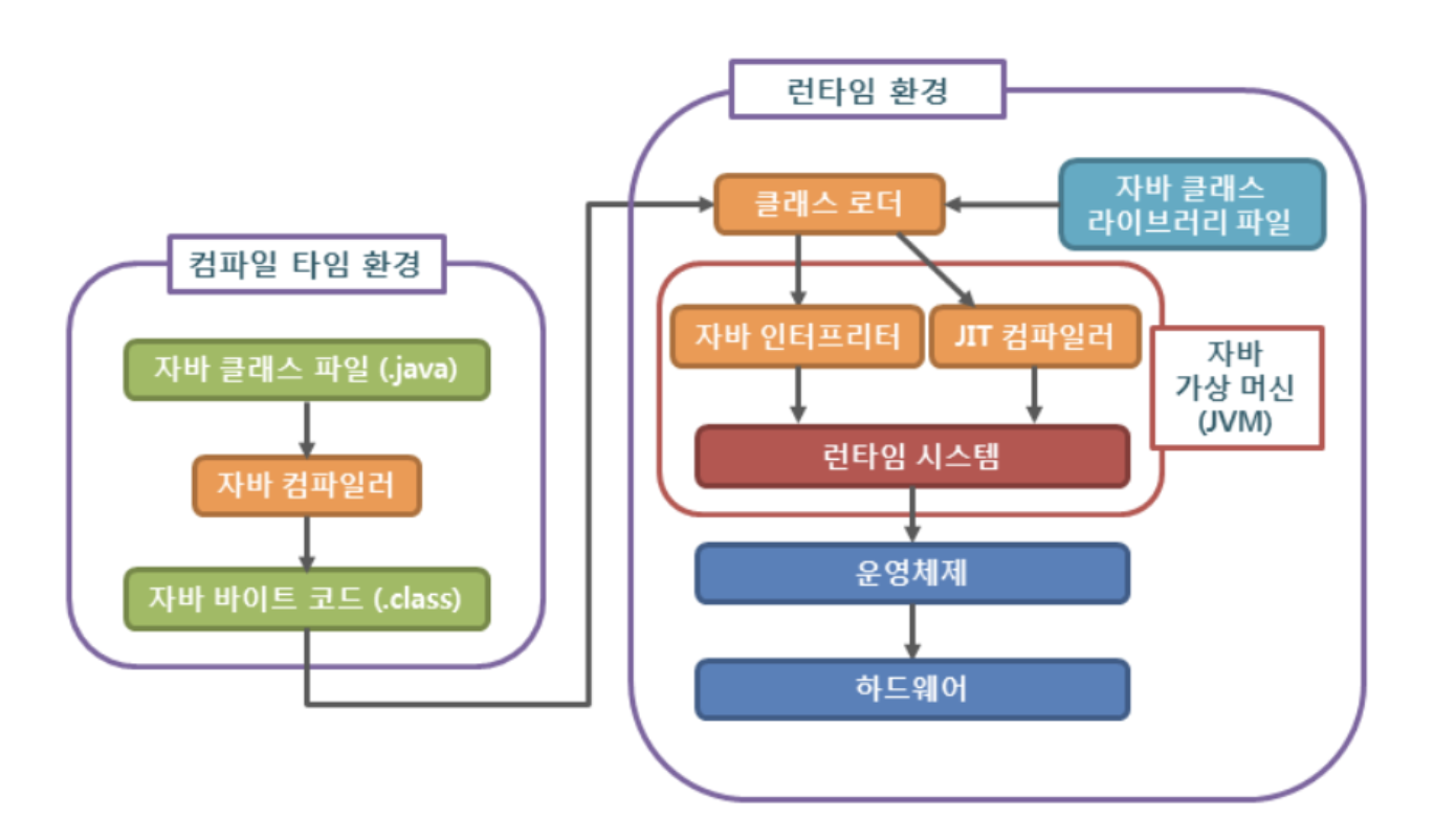 기존의 자바는 인터프리터 방식으로 명령어를 하나씩 실행하게끔 이루어져 있어 실행 속도가 느렸습니다. 그렇다고, 바이트 코드 전체를 프로그램 수행 초기에 모두 컴파일을 하게 되면 초기 속도가 너무 느리게 됩니다. 하지만 하드웨어가 발전하면서 자바 컴파일러도 JIT 컴파일러 방식으로 개선되어 속도적인 측면에서 상당한 개선을 이루었습니다.
